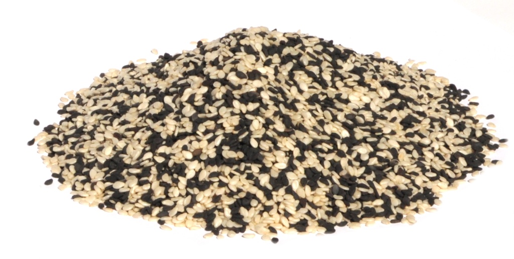 Black sesame seeds are unhulled and retain their natural dark coloring. White sesame seeds are the inner part of a seed after this hull (or skin-like shell) has been removed. Prior to processing, these seeds may have brown, red or black hulls. The unhulled black seeds contain more calcium, are crispier and have a slightly bitter flavor. Hulled seeds are softer, sweeter and nuttier. Traditionally, black sesame seeds have been preferred in Asian cuisine while the milder, white seeds are favored in Middle Eastern dishes such as hummus. Together, the blend of white and black seeds gives you the best of both.
