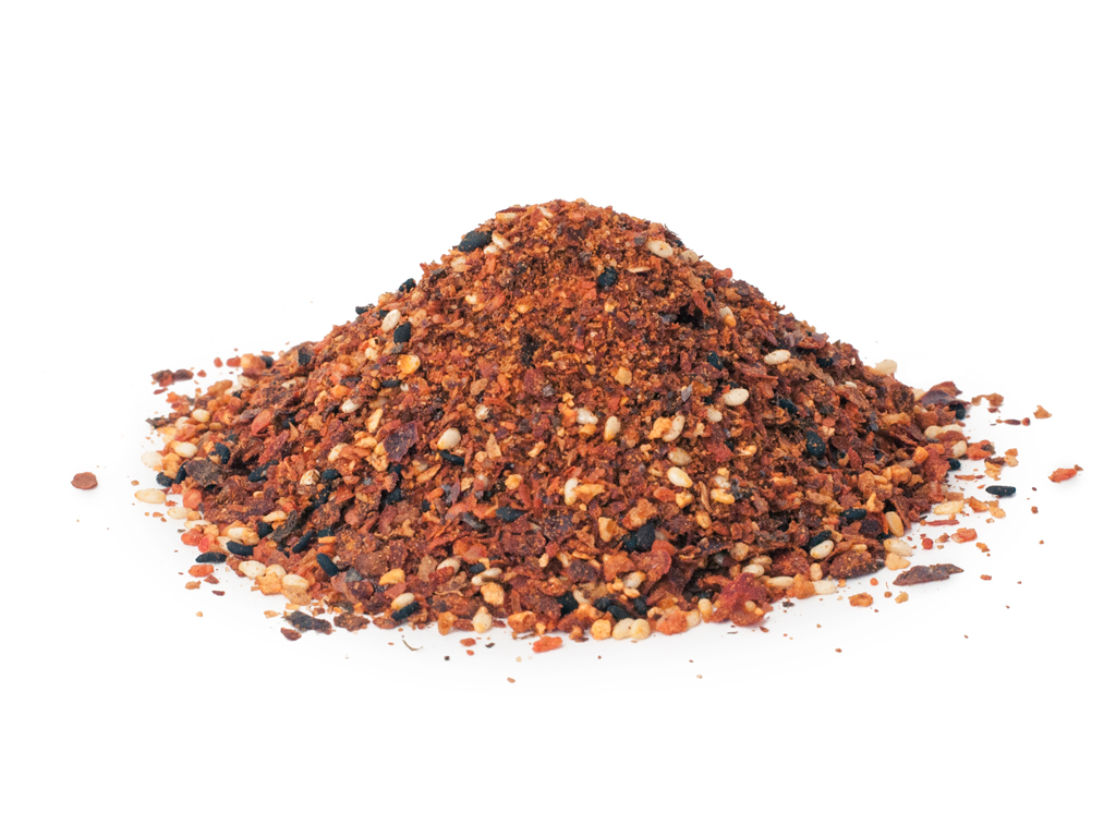 Shichimi togarashi is a common Japanese spice mixture that dates back to the 17th century, in what is now current day Tokyo. This coarsely ground special seasoning blend includes dried chiles, sesame seeds, orange peel, salt, granulated nori, and ginger powder. The most potent ingredient is dried chilis, but it’s the sesame, ground ginger , and nori that make for a distinctly Japanese flavor unlike other chile based spicy herb mixtures.
